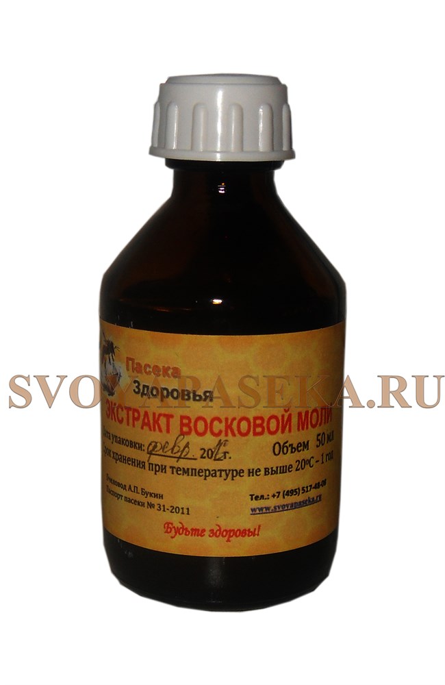 Экстракт личинок восковой моли купить можно у пасечников. Это уникальный продукт поможет восстановить силы после больших физических нагрузок, ускорит процесс заживления ран, операционных швов, затягивание рубцов, поможет снизить уровень холестерина в крови. Прием настойки помогает бороться с бессонницей, повышает физическую и умственную активность. Помогает в лечение туберкулёза и других заболеваниях органов дыхания.