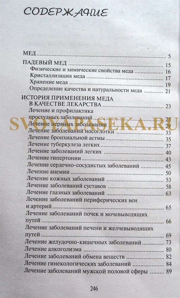 Первая глава издания посвящена сортам меда. Мед составляет основу пчелиного рациона и пчёлы заготавливают его в больших количествах, поэтому пчеловод без ущерба для пчелиной семьи может забрать часть этого драгоценного продукта и для себя. Натуральный качественный мед – это не просто еда, это уникальный лекарственный продукт природного происхождения. Издание рассказывает о том, что представляет собой мед, о его сортах, полезных свойствах. Большой раздел посвящён лечению мёдом различных заболеваний. В книге представлены рецепты от простуды, для лечения глаз, сердца, от гипертонии, суставных заболеваний, дерматитов, для укрепления организма, ухода за красотой кожи, волос и ногтей.